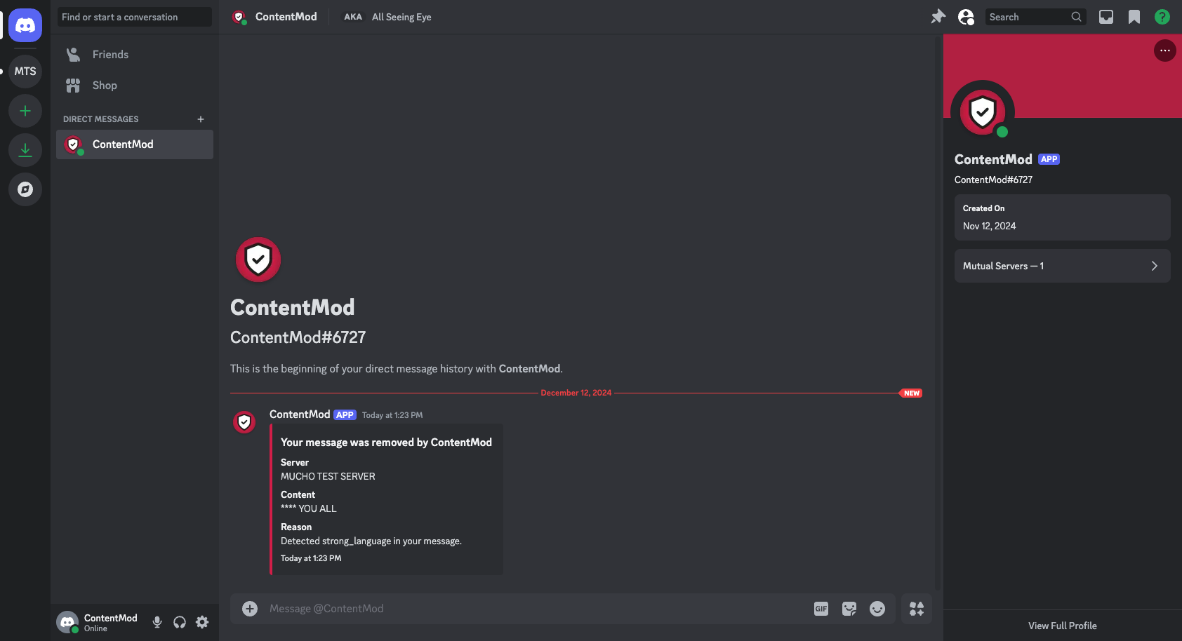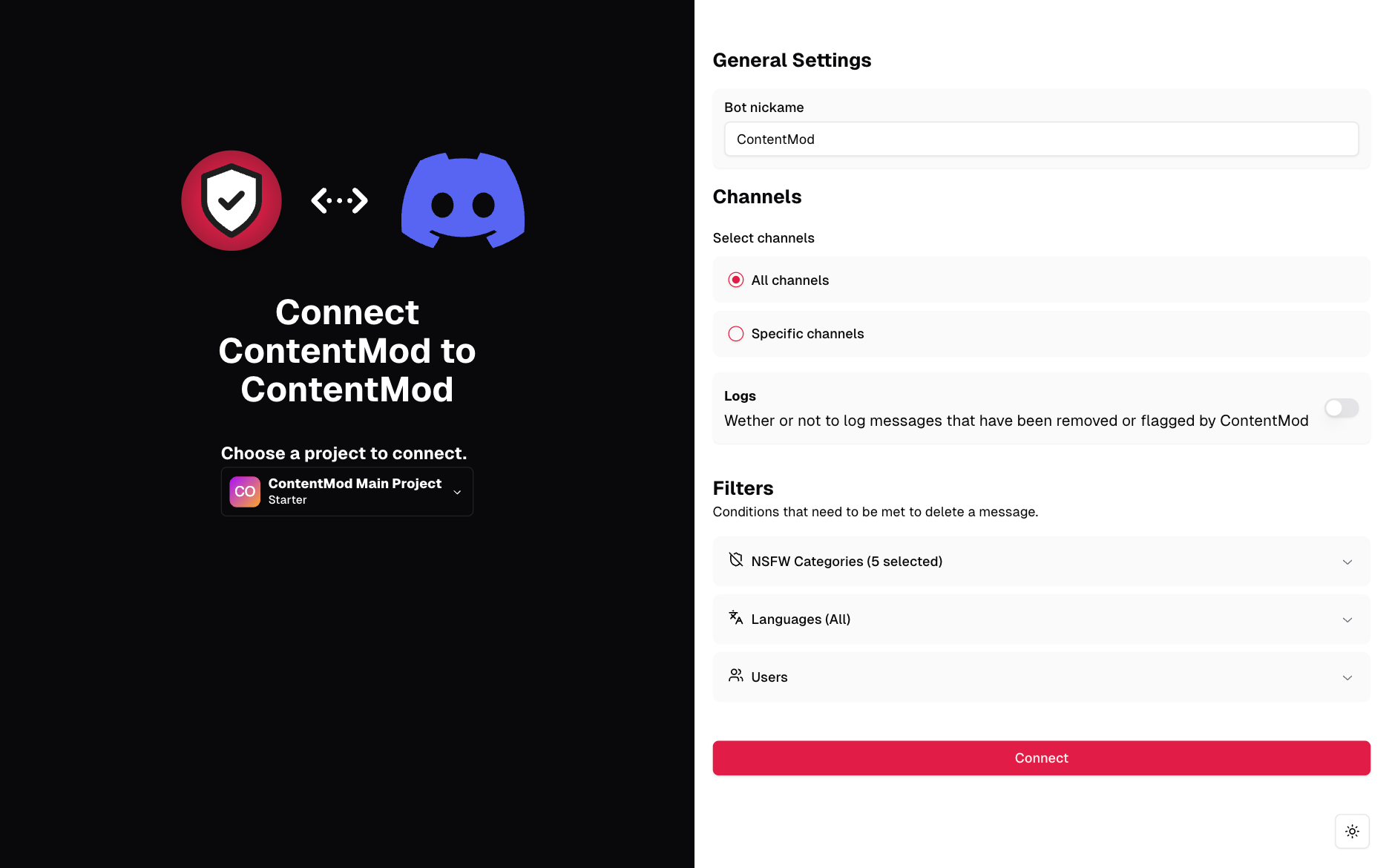 To get started with ContentMod on Discord, you will need to add our bot to your server. You can do this by clicking the button below:Connecting your Discord server