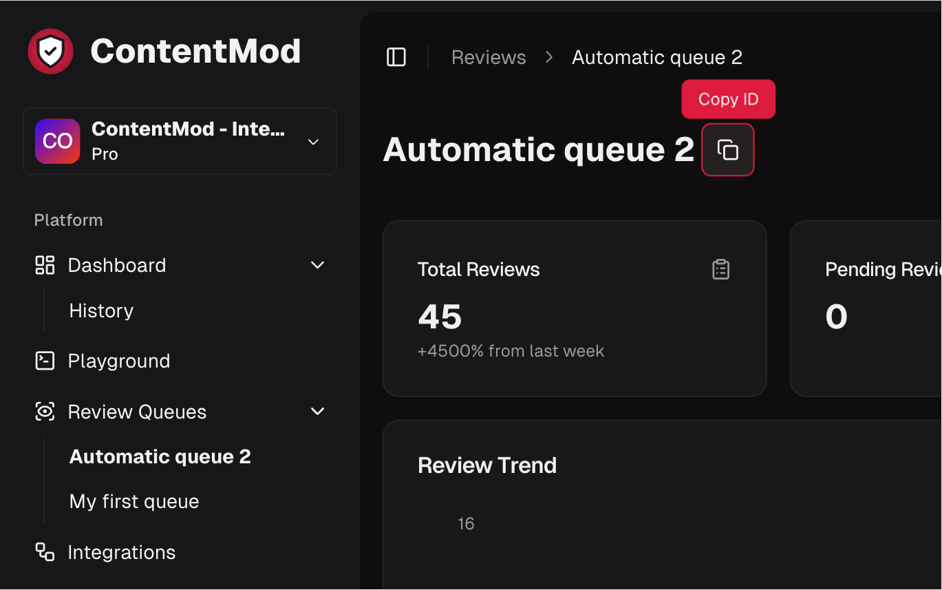 Once you have created a queue, you can find the queue ID in the URL of the dashboard. The queue ID is the last part of the URL. Or you can click the Copy button that is next to the name of the queue in the dashboard.