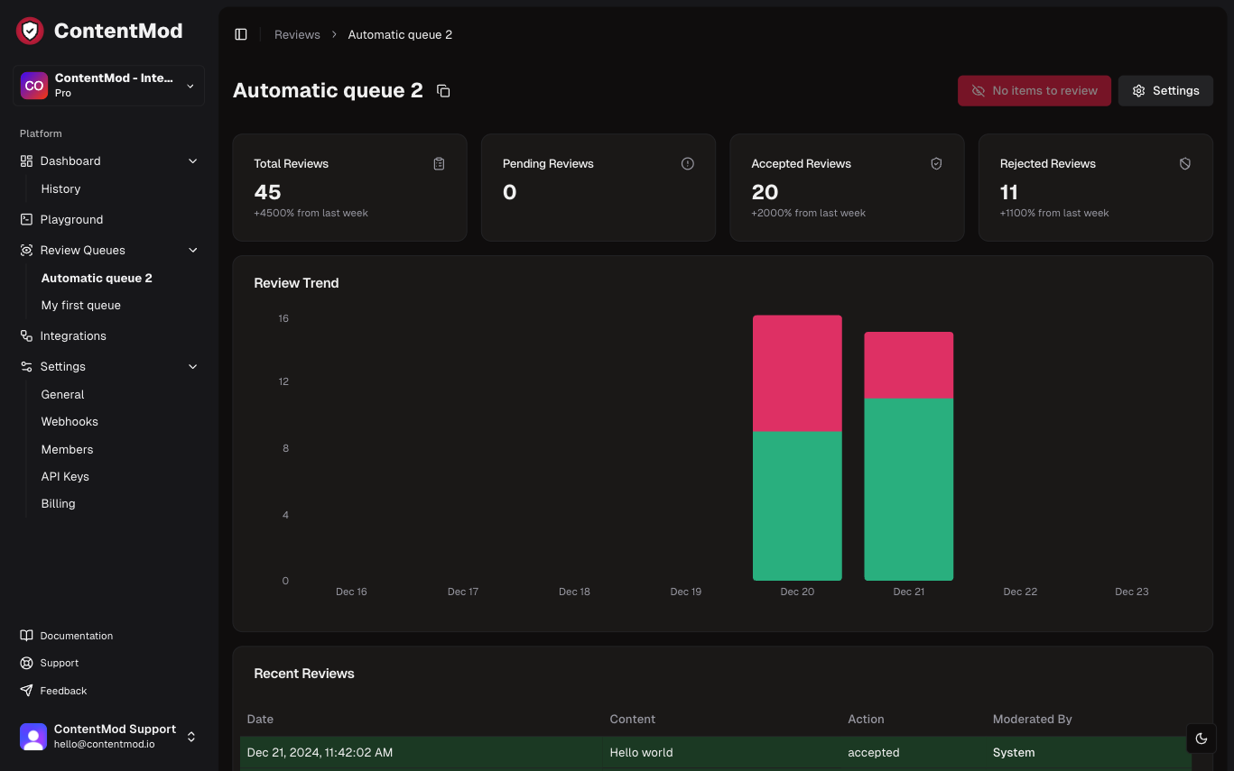 A manual review queue will require you to manually accept or review every single item in the queue. You can set it so it runs the moderation AI to generate a moderation report to help you review the content. A fully manual queue is available for every plan and is free to use forever.Posting Content